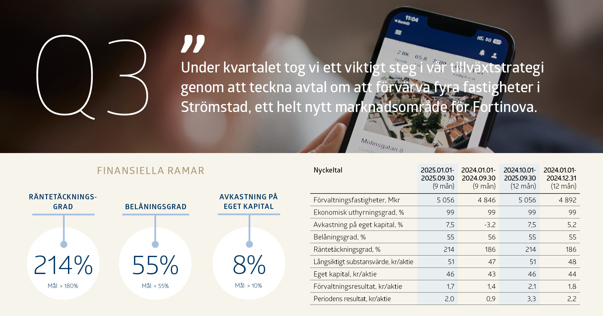 ”Fortinova står väl rustat, med en stark balansräkning, låg risknivå och en stabil förvaltningsverksamhet. Vi går in i nästa fas med fortsatt fokus på lönsam tillväxt och långsiktigt värdeskapande för våra aktieägare, hyresgäster och medarbetare” avslutar Anders Johansson.